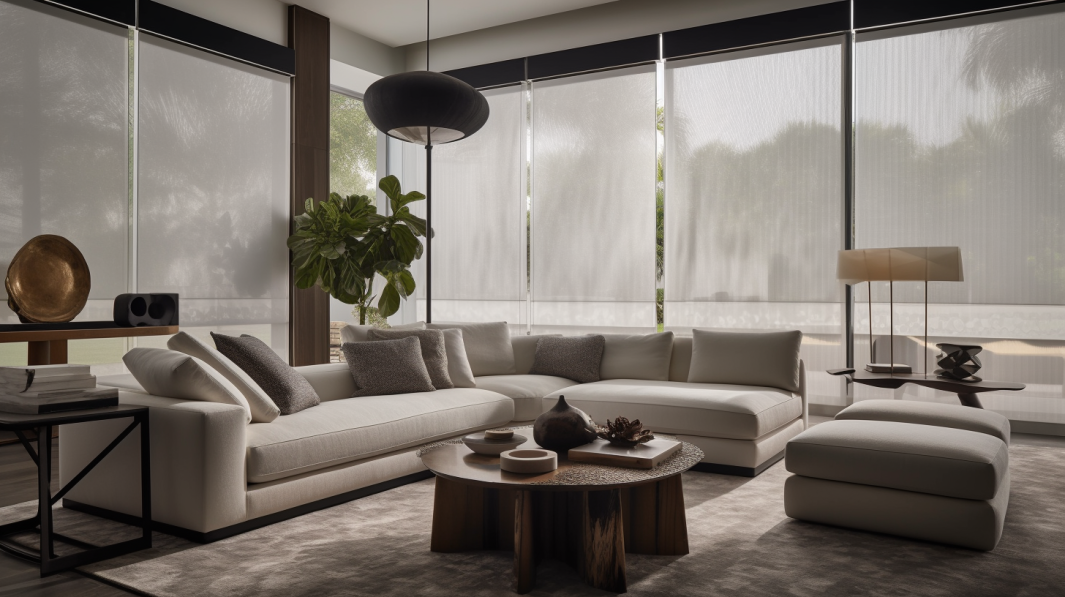 A contemporary formal living room with motorized screen roller shades, stylish furniture, and a cozy ambiance.