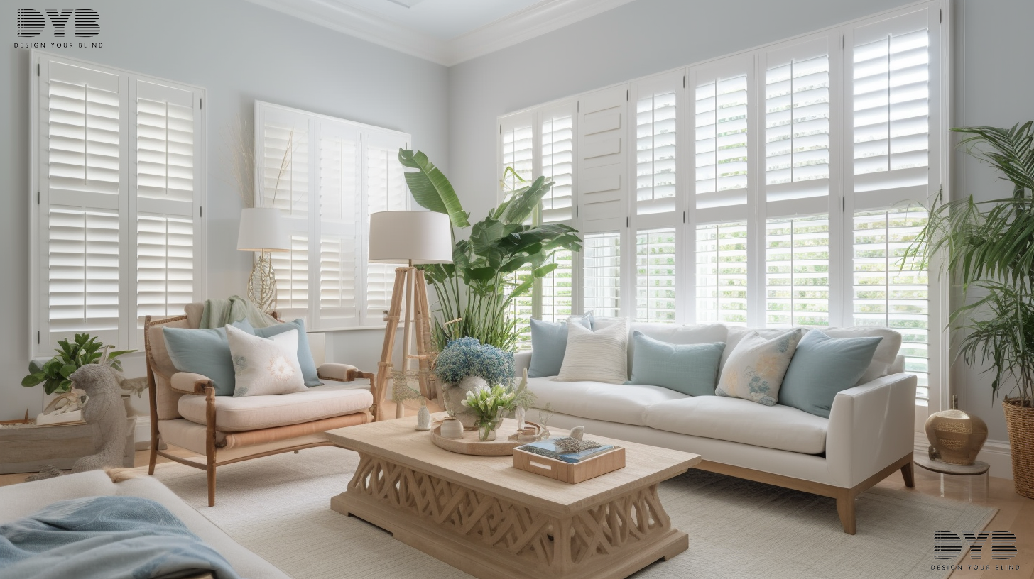 Plantation Shutters in a Boynton Beach living room, allowing soft light to stream through.