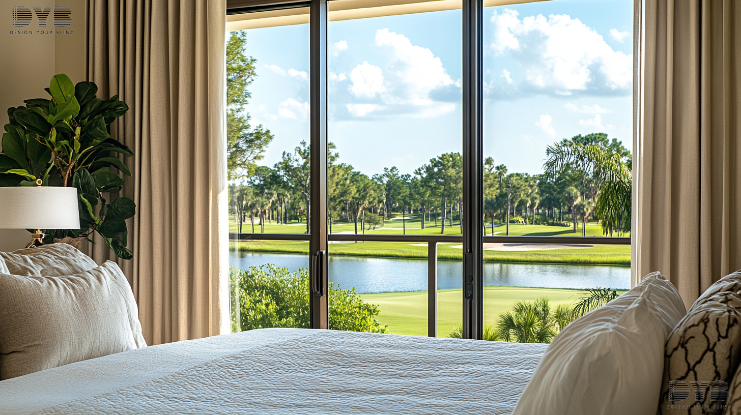 Blackout Curtains in Boca Raton, offering privacy and elegance in a contemporary bedroom setting. Arhaus furniture and golf course views complete the luxurious ambiance.