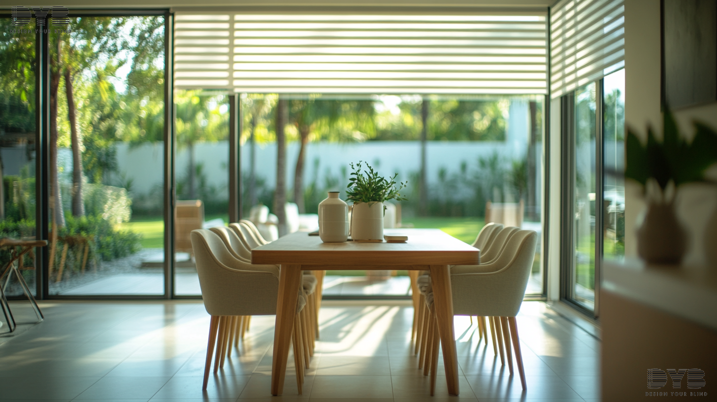 This minimalist Casual Dining Room in Palm Beach Gardens, FL, offers a serene and stylish setting for enjoying meals. With a dining table and chairs from Arhaus, the room reflects a minimalist approach to design, emphasizing clean lines and a neutral color palette. The windows are adorned with Zebra Shades, partially closed, allowing for a soft, diffused light to create a calming and peaceful atmosphere. The Zebra Shades are a prominent feature in the image, with their light and airy design blending seamlessly with the minimalist aesthetic of the room. The shades add a touch of sophistication to the dining area, offering both privacy and light control while maintaining a sense of openness and tranquility.