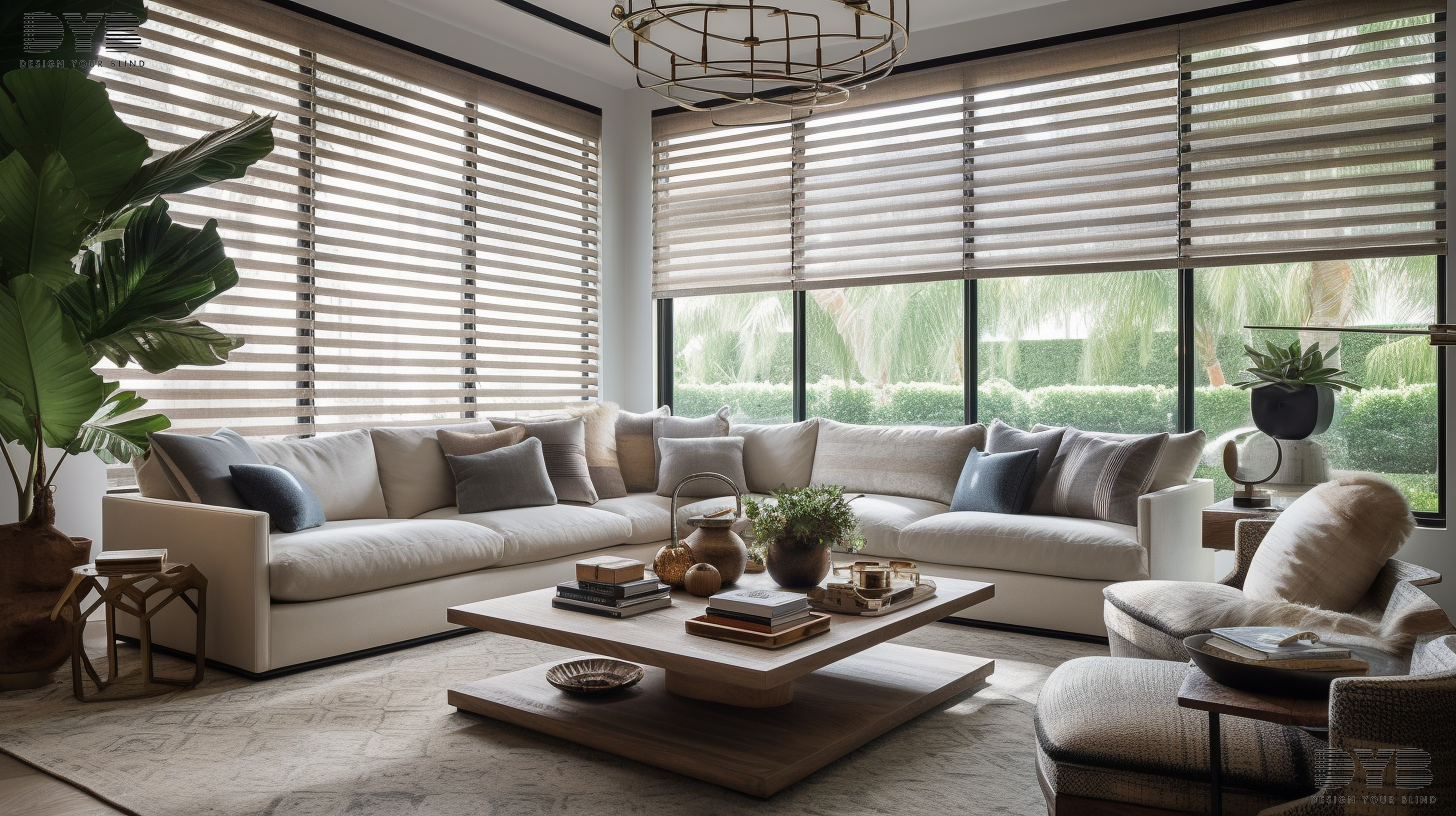 Close-up of designer banded shades in a transitional family room in Delray Beach, Florida