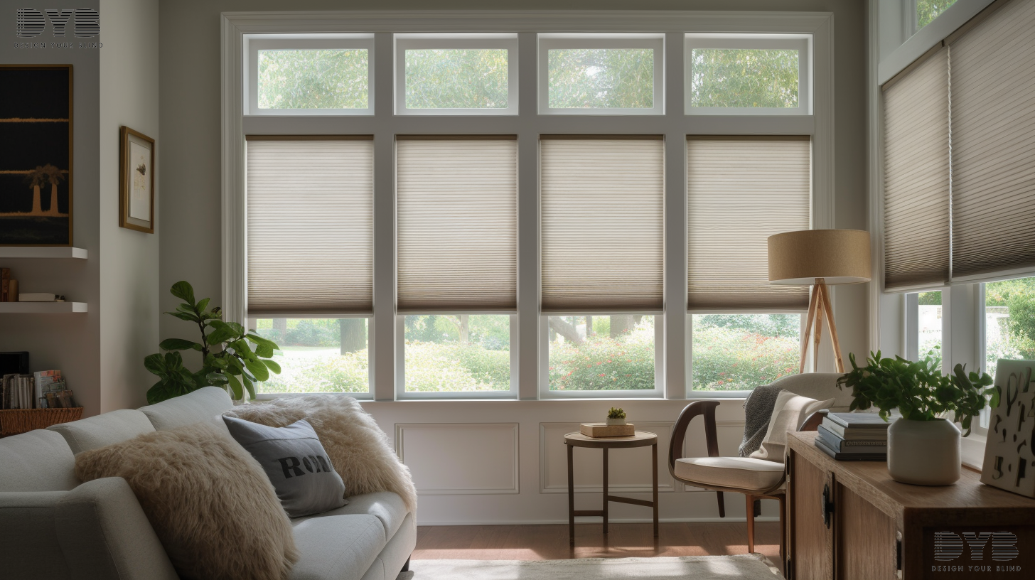 A close-up shot of a window with Honeycomb Shades in a Farmhouse Modern style living room.