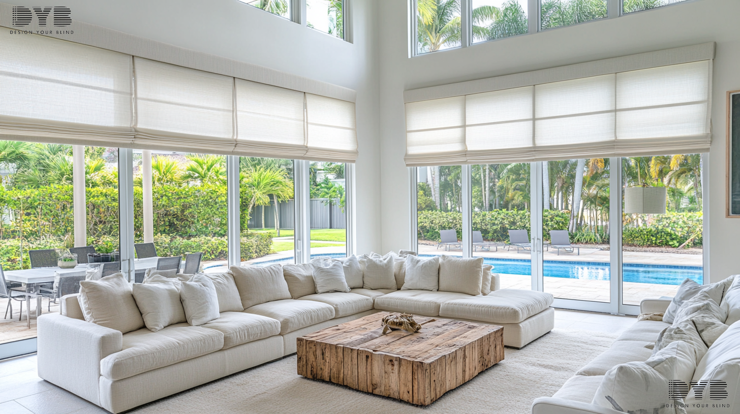 A bright and airy family room in Palm Beach Gardens, FL, with large windows overlooking a sparkling pool and a beautiful backyard. The windows are dressed with light-filtering Roller Shades, partially drawn to allow the sun’s rays to gently bathe the room. The room is styled in a Coastal design, featuring comfortable furniture from Arhaus, including a plush sectional and a rustic coffee table. The Roller Shades create a sense of breezy relaxation, complementing the casual yet elegant aesthetic. Shot type: natural light focus