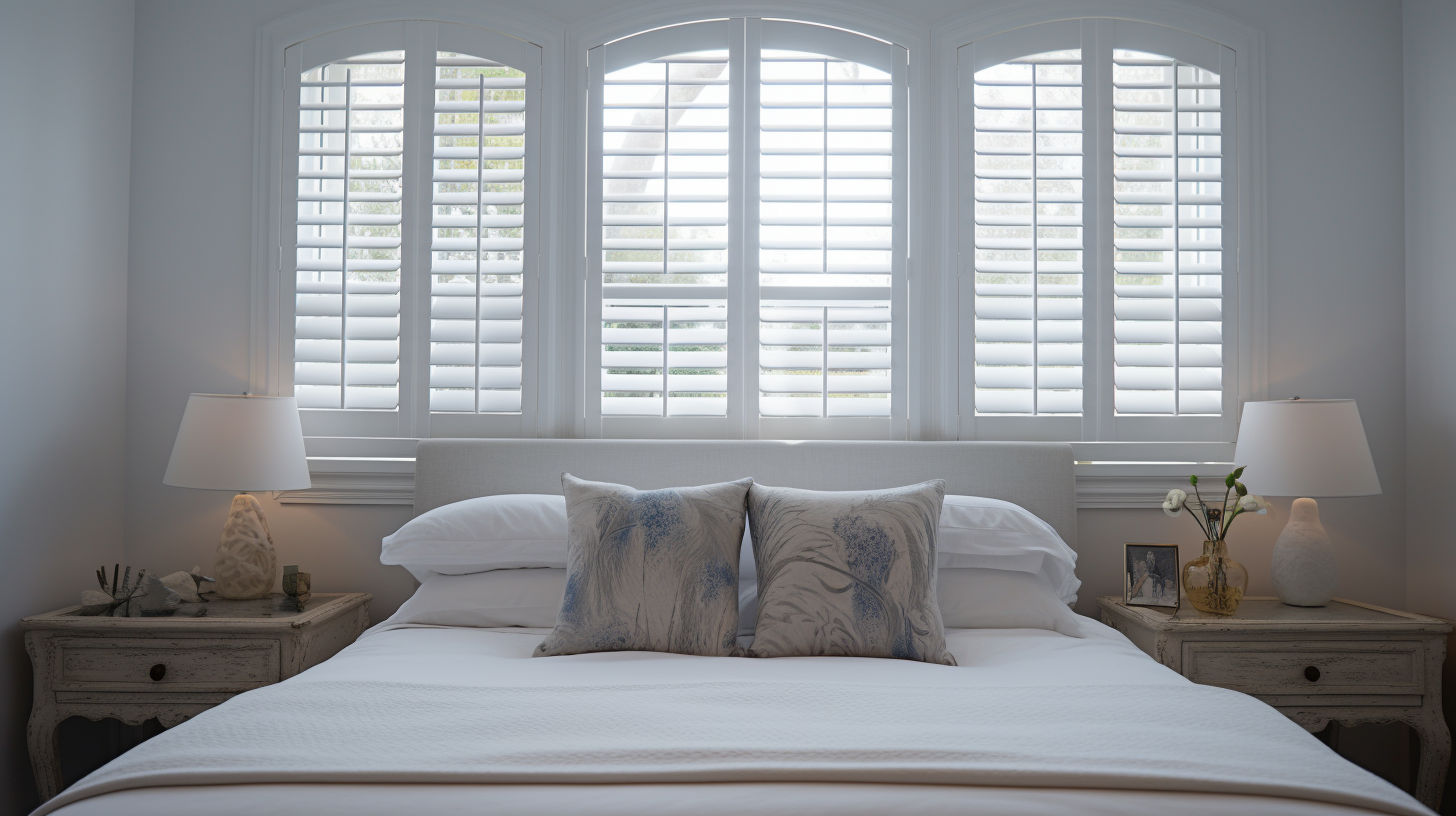 Fully closed white plantation shutters in a coastal bedroom in Delray Beach, Florida.