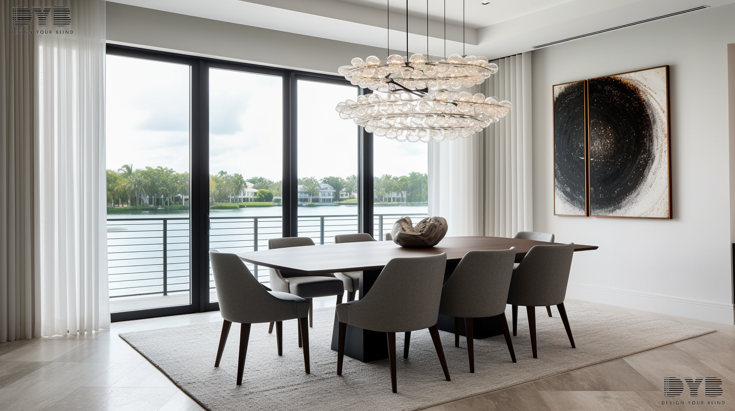 A modern Dining Room in Boca Raton, Florida, featuring Blackout Curtains that create a serene and stylish atmosphere. The room is furnished with pieces from Arhaus, including a spacious dining table and comfortable chairs. The Blackout Curtains are partially closed, allowing for a gentle stream of sunlight to filter through the room. The room is accented with a unique glass sculpture on a table, adding a touch of modern elegance to the space. The view of the Intercoastal Waterway adds a touch of serenity to the space.
