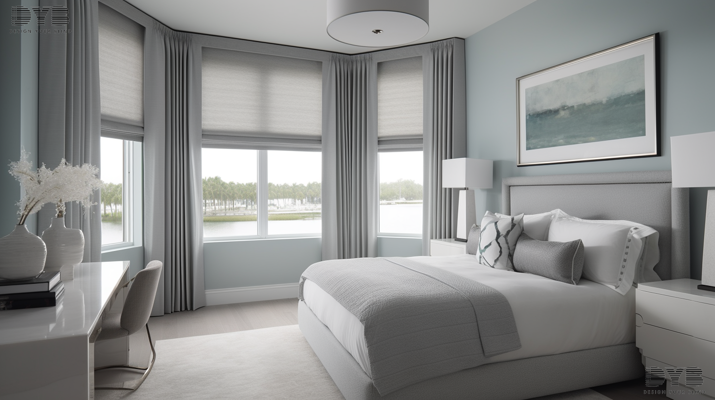 A serene guest bedroom in Boca Raton, FL, showcasing the practicality and comfort of Blackout Roller Shades. The fully closed shades block out all light, creating a peaceful and dark atmosphere ideal for a restful sleep. The shades are a light gray color, complementing the coastal style of the room, adding a touch of elegance and tranquility to the space. The room features a king-sized bed with plush bedding, a nightstand, and a reading lamp, all perfectly protected from the sun’s glare.