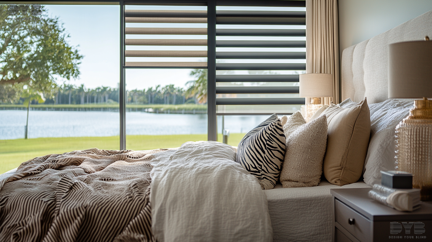 A tranquil Guest Bedroom in Lighthouse Point, FL, showcases the benefits of Zebra Shades for creating a peaceful and inviting atmosphere. The shades allow for privacy and light control, while the Crate & Barrel furniture adds a touch of elegance and comfort.