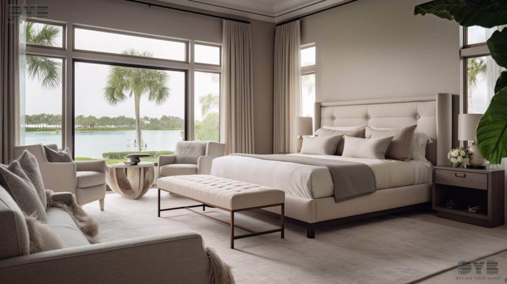 Master bedroom in Delray Beach, Florida with designer banded shades and lake view