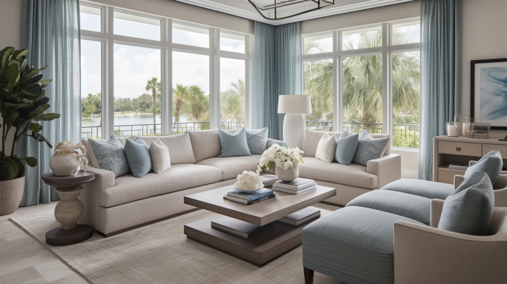 Motorized Roller Shades in a coastal family room with a canal view in Parkland, Florida.