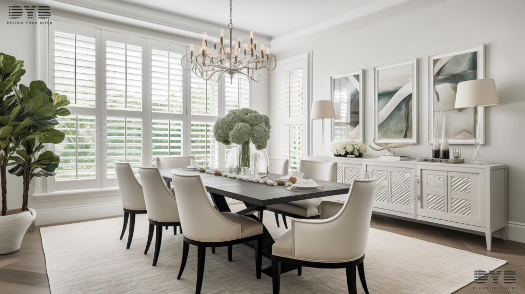 Stylish dining room in Boynton Beach, Florida, with white Plantation Shutters on windows overlooking the backyard and transitional-style furniture.