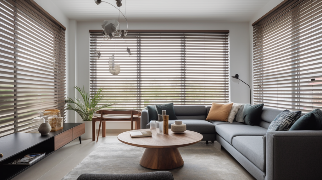 Partially open faux wood blinds in a modern living room in Boca Raton, Florida.