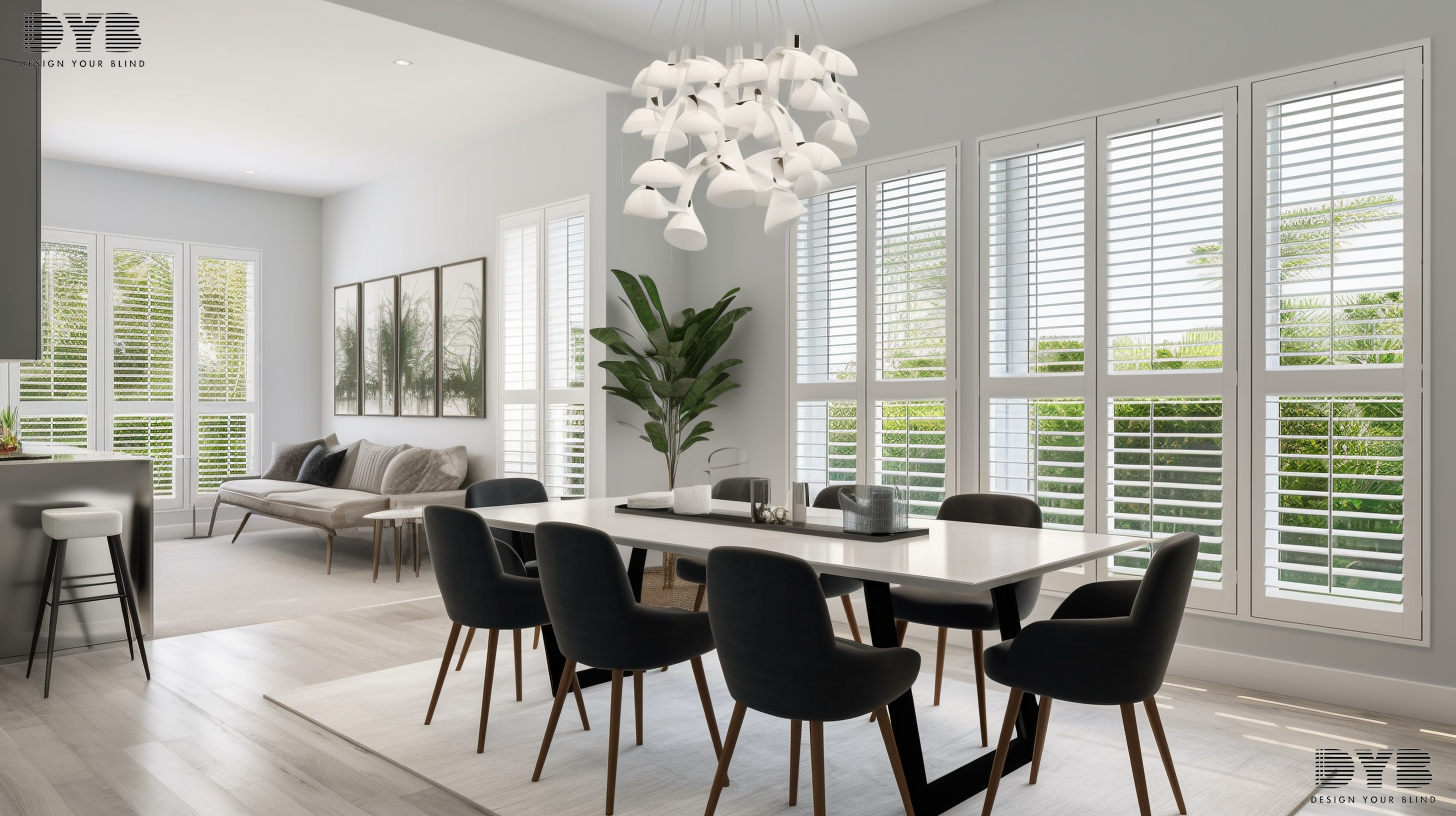 Modern Boca Raton dining room with white Plantation Shutters for a touch of elegance and functionality.