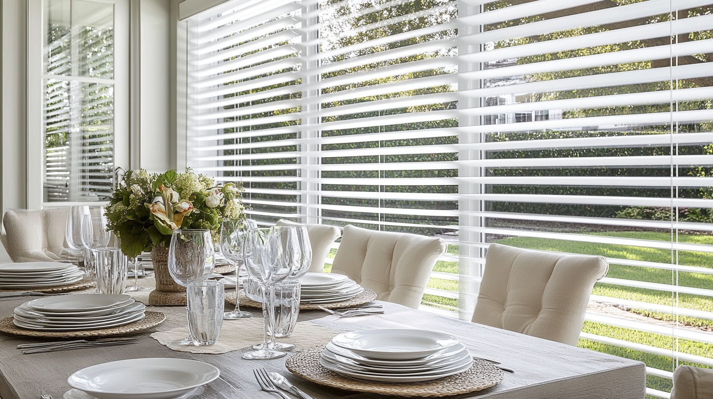 White faux wood blinds in a Boca Raton home, offering an elegant view of the backyard.