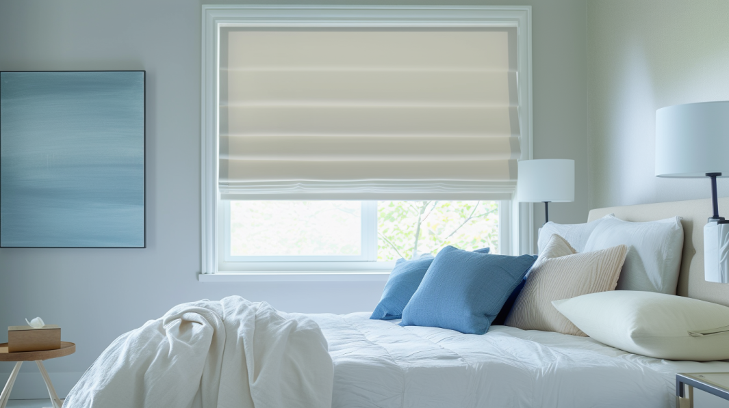Cream blackout Roman Shades with edge banding in a Delray Beach guest bedroom, enhancing light control and comfort.