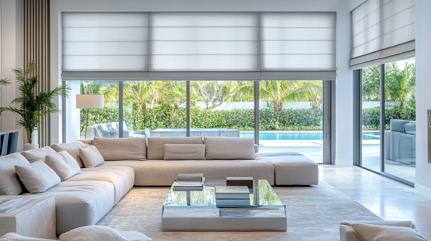 Modern Living Room with Grey Motorized Roman Shades in Boca Raton