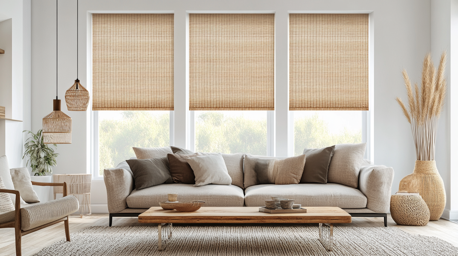 A modern living room in Boca Raton, FL, featuring motorized woven wood shades in a natural tone on large windows. The shades create a warm, earthy ambiance while providing flexible light control with a touch of convenience. The room is styled with a contemporary sofa, a wooden coffee table, and tasteful decor accents that complement the organic texture of the shades. This combination of natural elements and modern design results in a sophisticated and inviting living space.