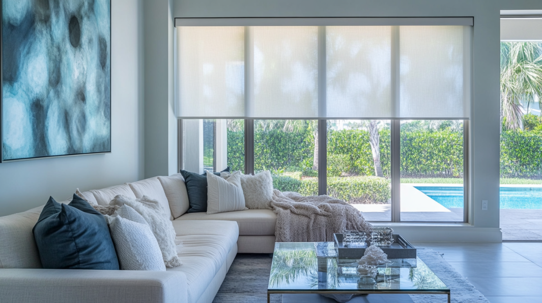 A coastal-inspired formal living room in Boca Raton, FL, featuring a plush sofa draped with a throw blanket, a sleek glass coffee table, and a large abstract wall art piece. Soft, diffused light filters through partially closed Hunter Douglas Roller Shades, casting a warm and inviting glow throughout the room. The Roller Shades, seamlessly integrated into the coastal design, serve as a focal point, enhancing the relaxed yet luxurious feel. Large windows provide a view of a sparkling backyard pool, adding a touch of elegance and tranquility.