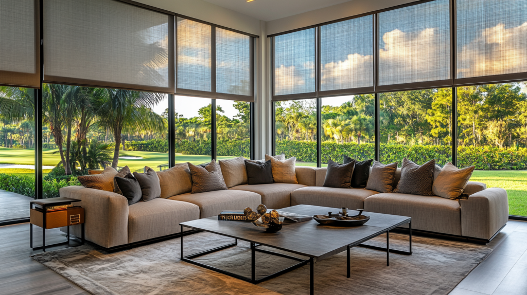 This formal living room in Coral Springs showcases a modern interior design, featuring a plush sectional sofa from Arhaus and a sleek coffee table. The space is bathed in soft, natural light streaming through large windows adorned with fully closed motorized Hunter Douglas Roller Shades in a deep, rich charcoal grey. The shades create a sophisticated ambiance while framing a panoramic view of the golf course, adding tranquility to the room.