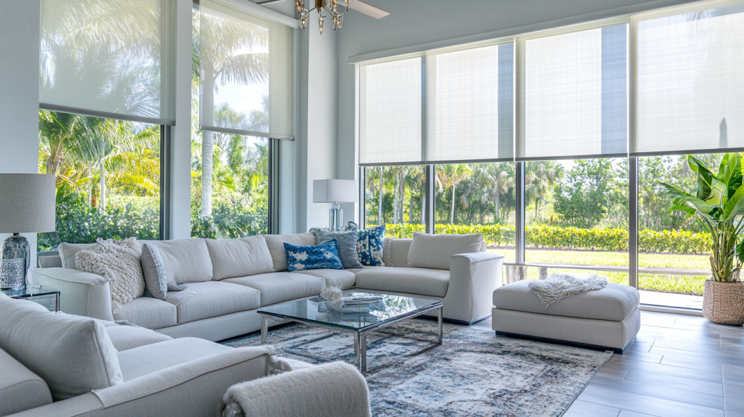 This bright and airy family room in Delray Beach showcases a large window adorned with Hunter Douglas Roller Shades made from light-filtering fabric. The shades are partially closed, allowing gentle sunlight to diffuse through, creating a warm and inviting atmosphere. Designed in an Urban Modern style, the room features sleek and contemporary furniture, including a plush sectional sofa, glass coffee table, and modern rug. Together, these elements complement the window treatments and enhance the relaxed, natural-light-filled ambiance. The large window offers a view of a lush garden, bringing a touch of greenery indoors.