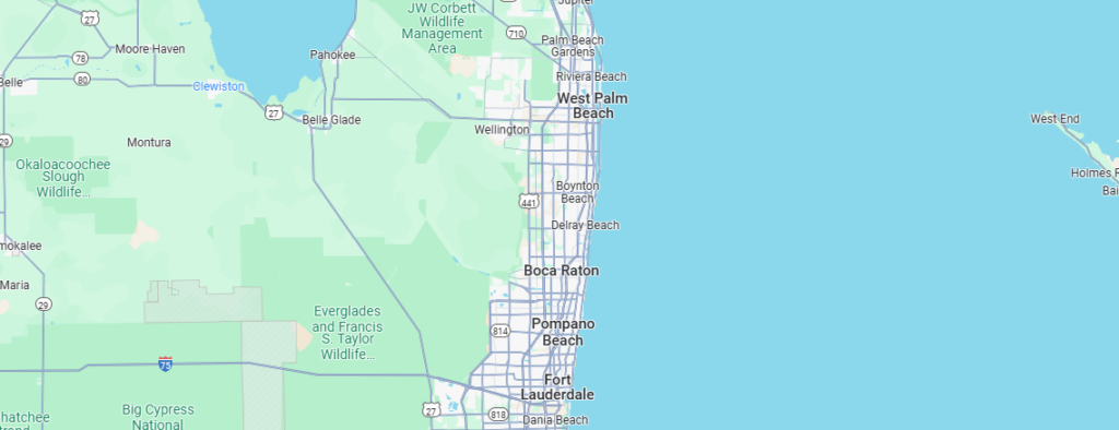 This map illustrates the service areas covered by Design Your Blind, showcasing their reach across neighborhoods in Palm Beach County and north Broward County. The highlighted regions represent areas where customers can enjoy personalized in-home consultations and premium window treatment services.