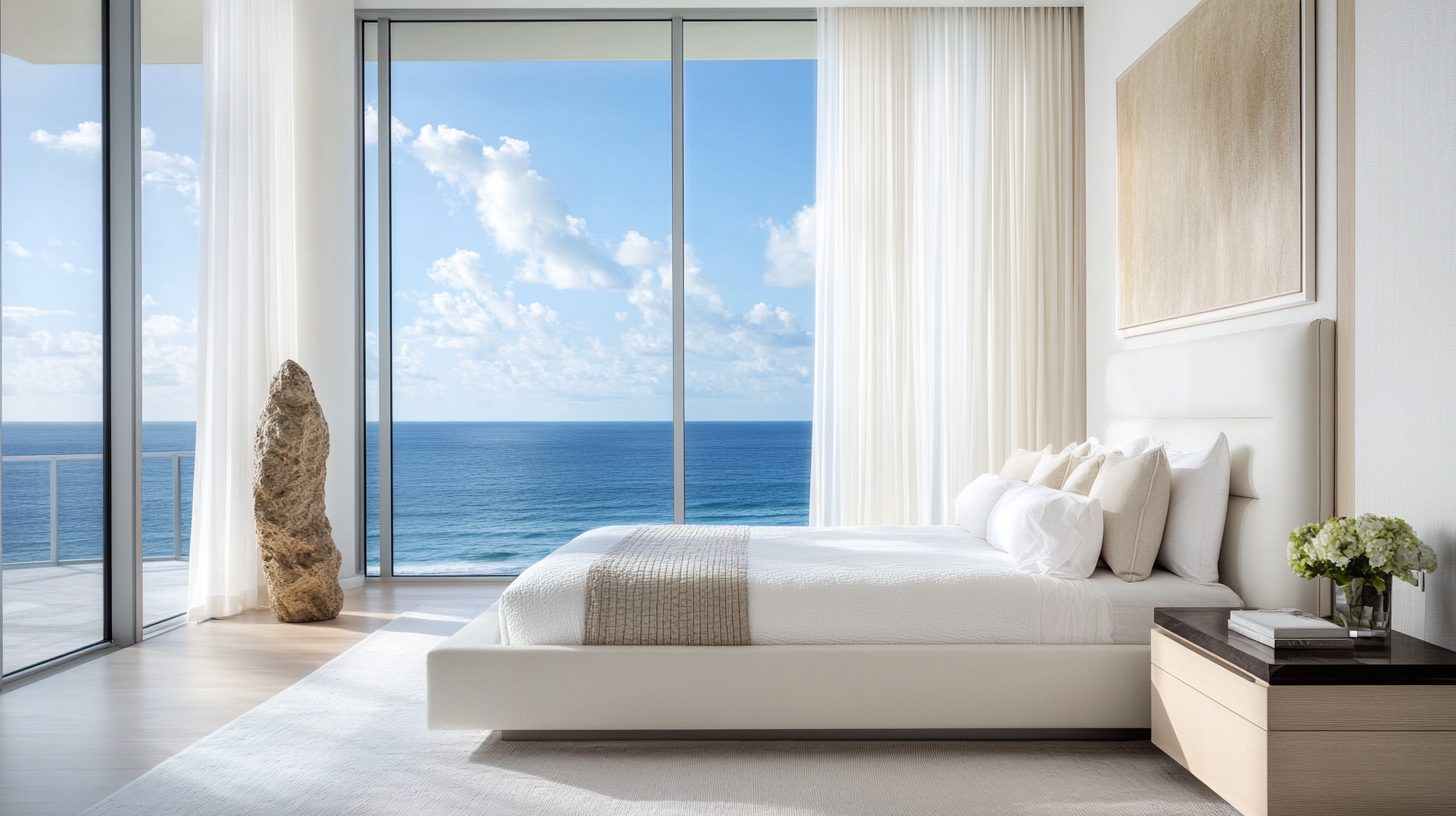 This master bedroom in Ft Lauderdale is styled in a Minimalist interior design, featuring a sleek white bed with plush bedding. Large windows are adorned with motorized sheer curtains, fully closed to create a soft, diffused light while offering privacy and a sense of tranquility. The room is accented by a contemporary sculpture on the nightstand, complementing the minimalist aesthetic. The furniture, including the bed, is from Ethan Allen, enhancing the room’s refined and serene atmosphere.