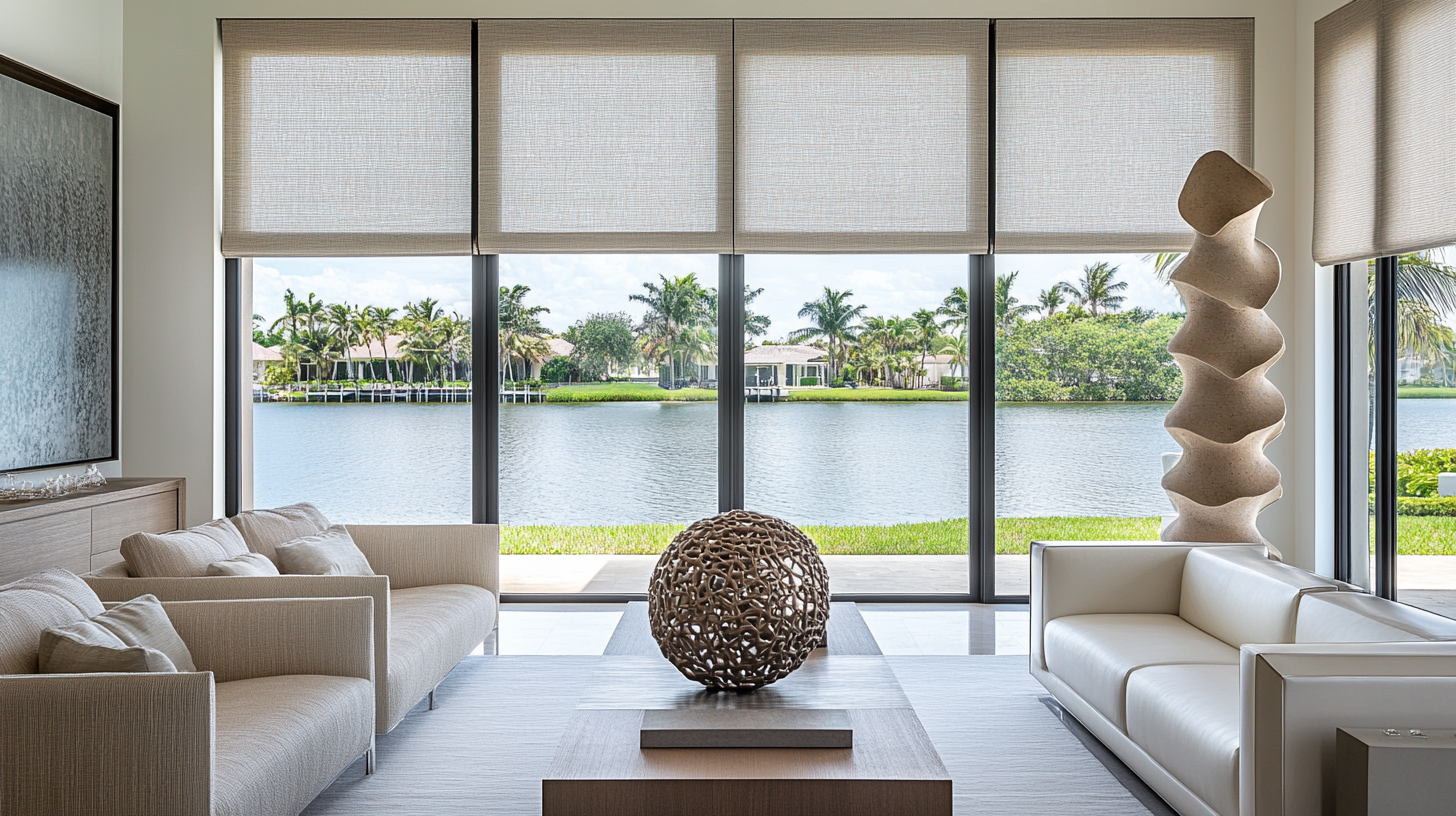 This formal living room in Lake Worth is styled in a Modern interior design, highlighted by large windows adorned with fully closed motorized Hunter Douglas Roller Shades. The room is accented by a contemporary sculpture on a table, adding a sophisticated artistic touch. The windows provide a tranquil view of the Intercoastal, enhancing the serene and refined atmosphere of the space.