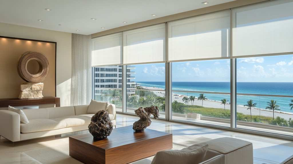 Modern formal living room in a Palm Beach apartment featuring motorized white Hunter Douglas Roller Shades on large sliding glass doors and an ocean view.