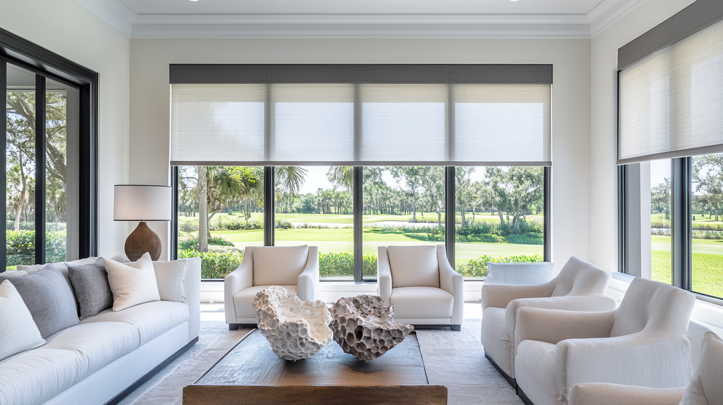 Modern living room in Palm Beach Gardens with Motorized Hunter Douglas Roller Shades and a serene golf course view.