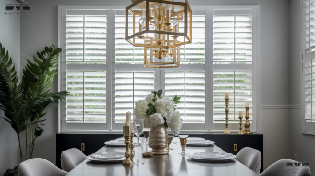 Medium-close-up of a window with Plantation Shutters in a transitional-style dining room in Boynton Beach, Florida