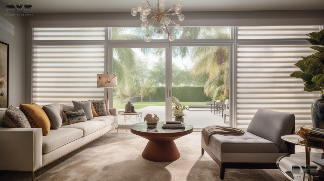 A Formal Living Room in Delray Beach, FL, featuring a Transitional style. The room is accented with a contemporary sculpture and large windows with Zebra Shades, partially closed. The windows overlook a garden, providing a tranquil view. The room is furnished with comfortable seating from Arhaus.