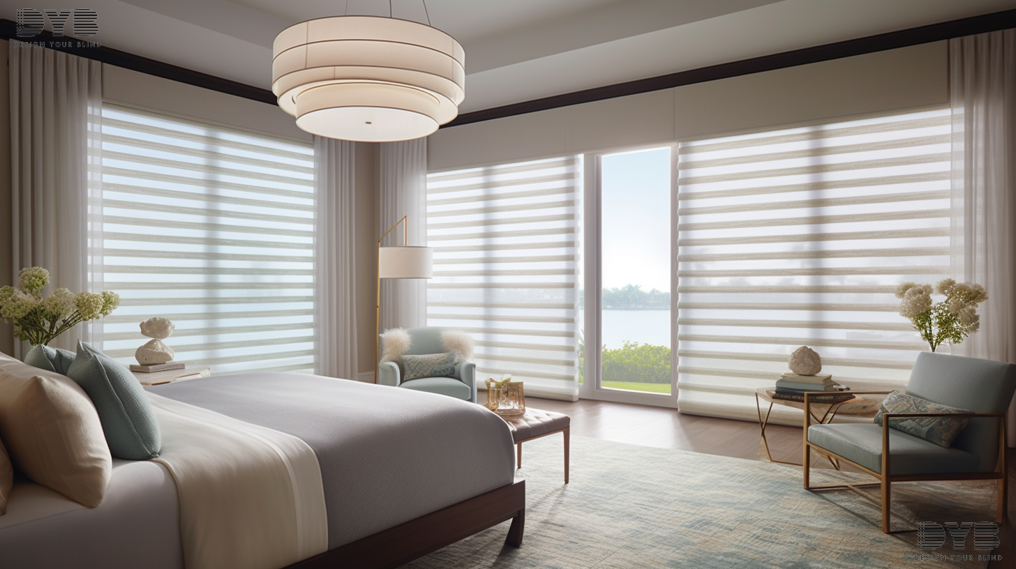 This serene bedroom in Highland Beach features Designer Banded Shades on large windows overlooking a tranquil lake. The shades offer a balance of light and privacy, creating a peaceful atmosphere. The soft color palette and cozy furnishings complement the shades’ elegant design.